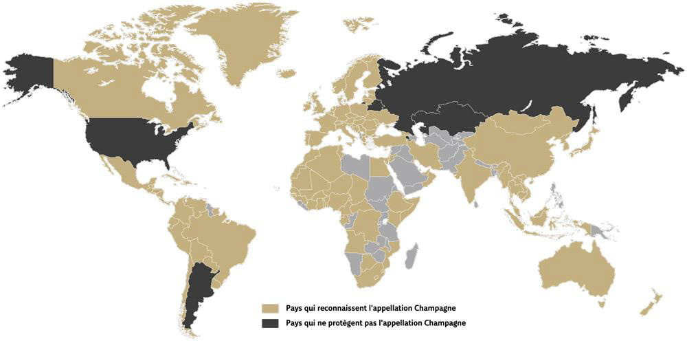 Aujourd’hui, grâce à l’action quotidienne du Comité Champagne, l’appellation Champagne est reconnue et protégée à travers plus de 121 pays. Références : champagne.fr